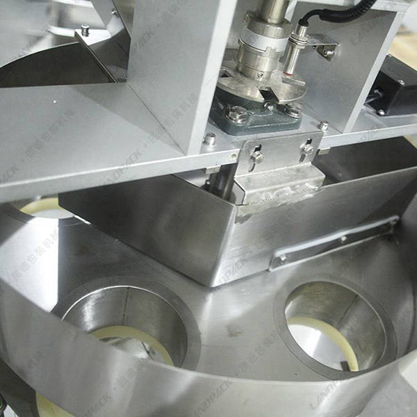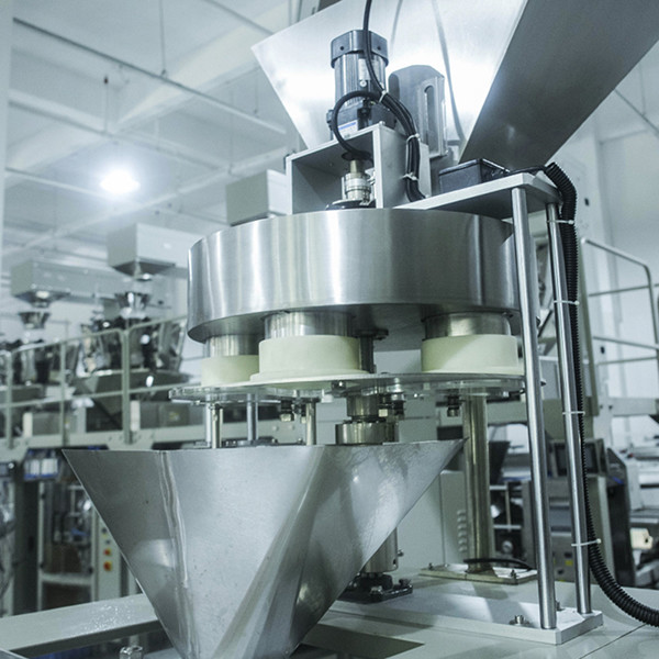 該機(jī)使用了轉(zhuǎn)盤定量包裝系統(tǒng),配合Z型物料提升機(jī)使用,工作人員只要講物料倒入提升機(jī)的振動(dòng)儲(chǔ)料斗當(dāng)中,然后輸送到三角型裝置的料斗當(dāng)中,伺服電機(jī)控制量杯進(jìn)行物料的計(jì)量,通過(guò)旋轉(zhuǎn)裝置把量杯當(dāng)中的物料倒入袋裝當(dāng)中,進(jìn)行封口輸出等一系列工作完成自動(dòng)包裝。