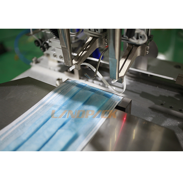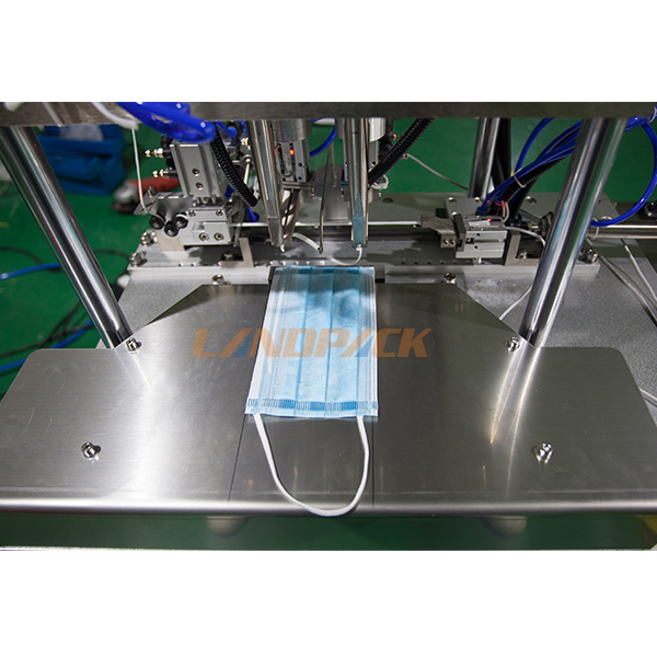 這臺機器比起那種小型焊接機效率比較高,不需要人工提前把耳線進行修剪。機器自動完成耳帶的切斷,我們只需要把耳線掛到機器即可。